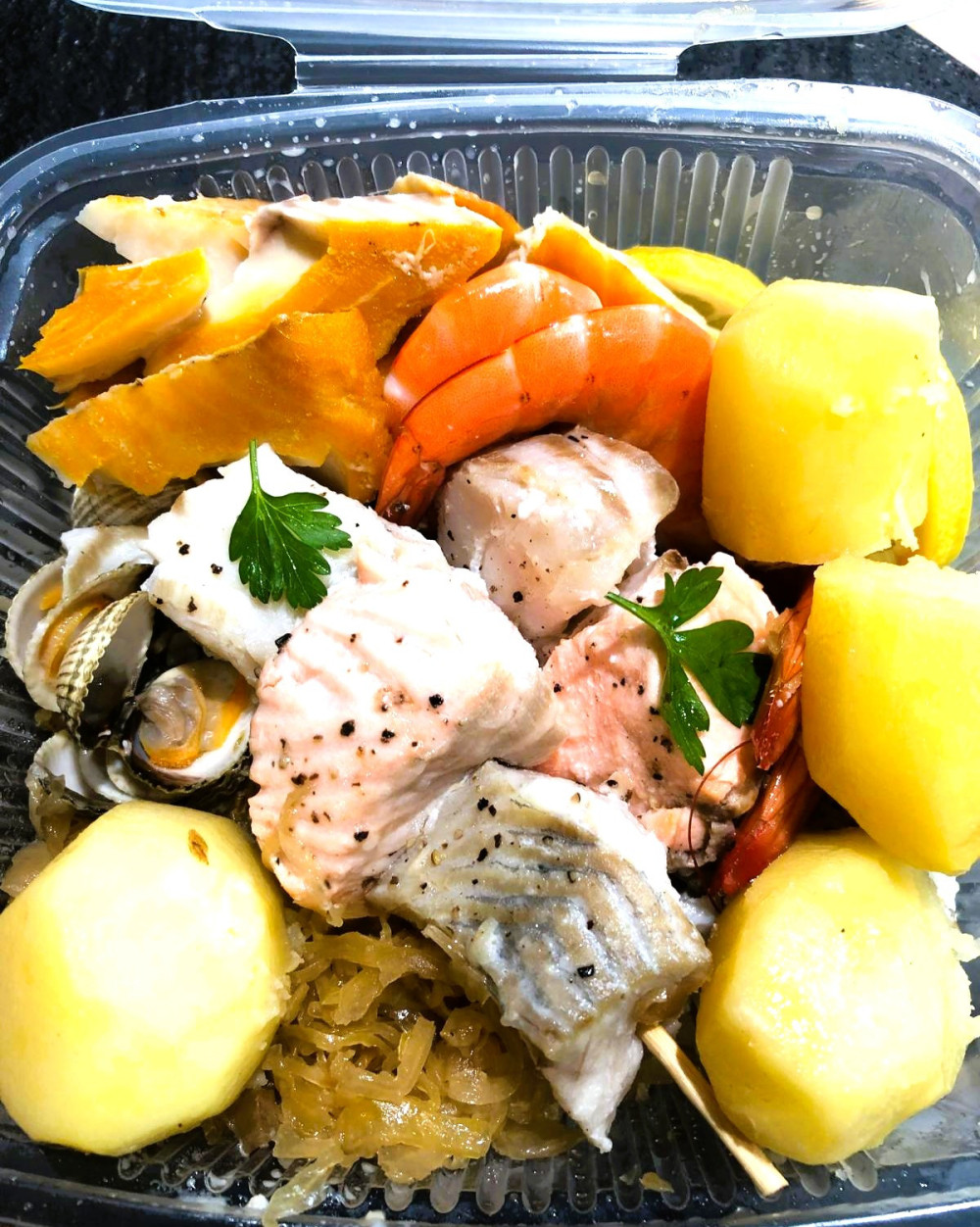 Une recette réalisée dans nos ateliers avec des produits frais: du bon chou cuit à l'alsacienne, du saumon, du cabillaud et du haddock fumé, accompagnés de pommes de terre fondantes, de crevettes et de moules... La régalade !
