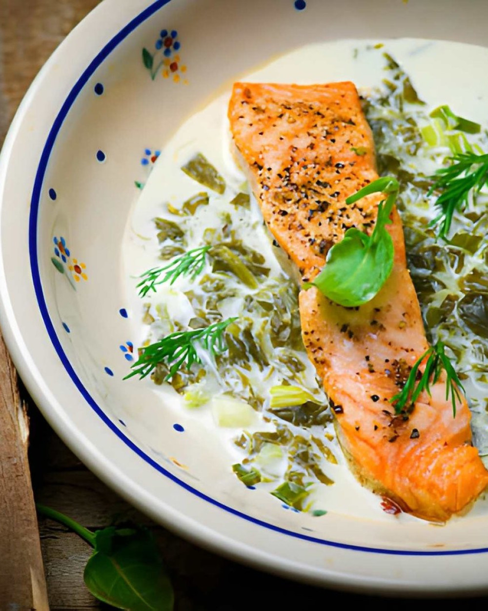 Notre pavé de saumon est délicatement cuit pour rester nacré et fondant à cœur, puis nappé d’une sauce à l’oseille juste ce qu’il faut acidulée pour réveiller le tout sans jamais masquer le poisson. À côté, des pommes de terre grenailles, cuites à l'eau, qui s’imprègnent de la sauce et finissent le travail.